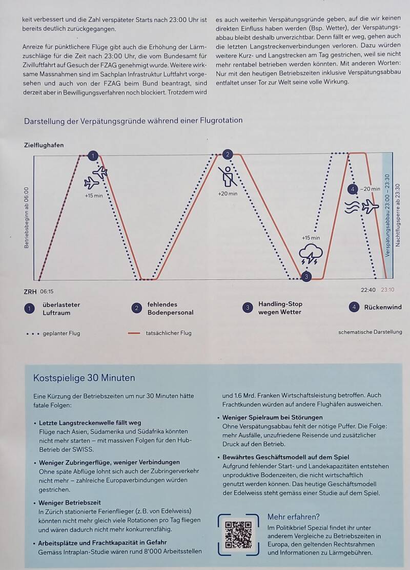 Im Mitarbeitermagazin homebase wiederholt der Flughafen seine manipulative Falschinformation. Ohne sie zu benennen wird bereits zur Nachtruheinitiative Stellung genommen. In Kürze: - die selbstangeeignete Betriebszeitverlängerung wird als essentiell und betriebsgefährdend dargestellt; - der Verspätungsabbau ist für das Drehkreuz unerlässlich und legitim; - die Verspätungen sind gott-gegeben; - die Verspätungen sind wegen dem Auftrag vom Bund nicht zu vermeiden usw. Im Politbrief ist dasselbe Narrativ zu lesen.